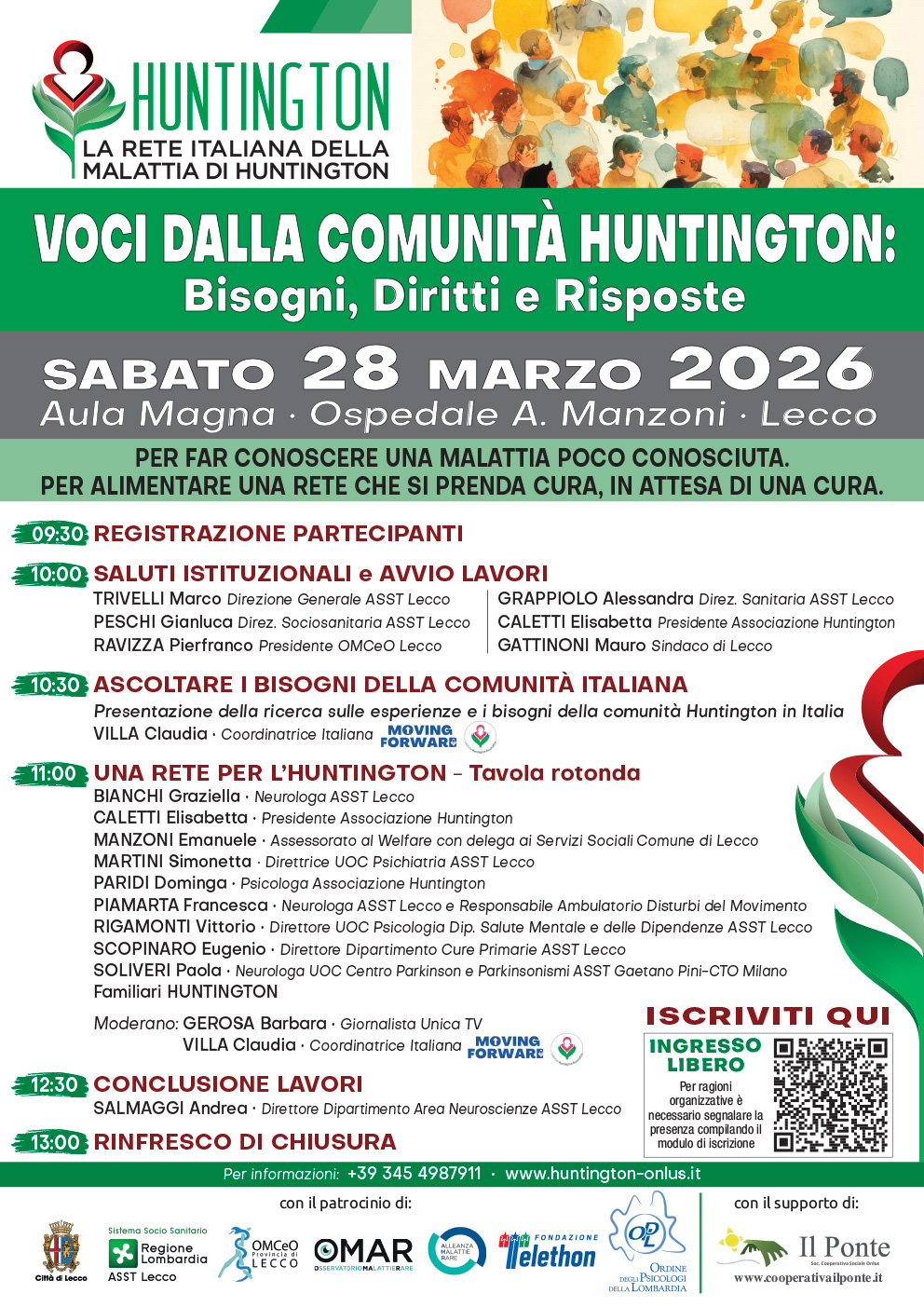 Sabato mattina 28 marzo 2026 si terrà a Lecco, presso l’Aula Magna dell’Ospedale Alessandro Manzoni, un evento dal titolo Voci dalla comunità Huntington: bisogni, diritti e risposte, promosso dall'Associazione Huntington onlus, con il supporto della struttura sanitaria.
